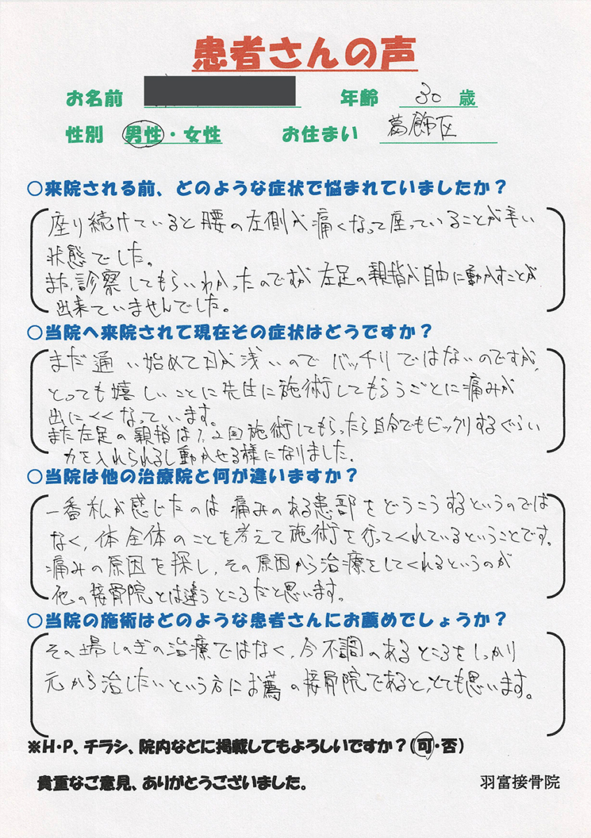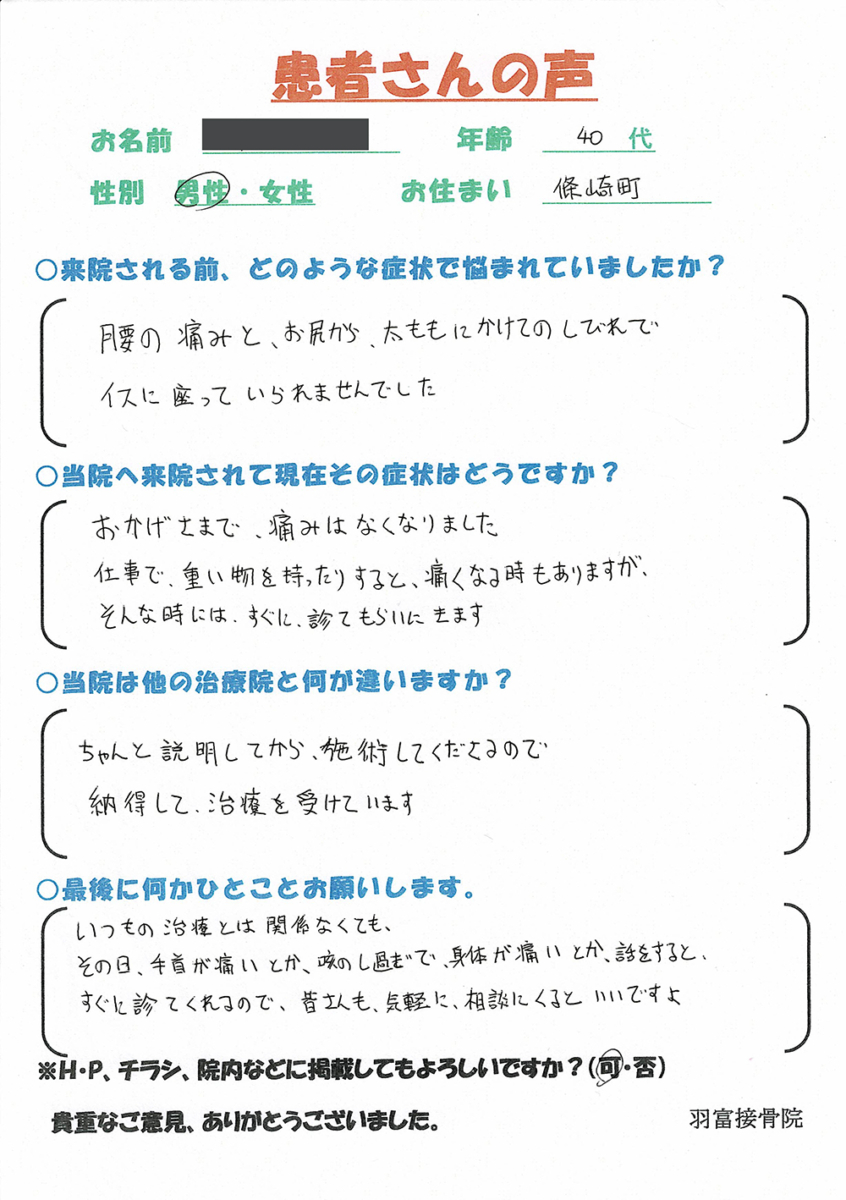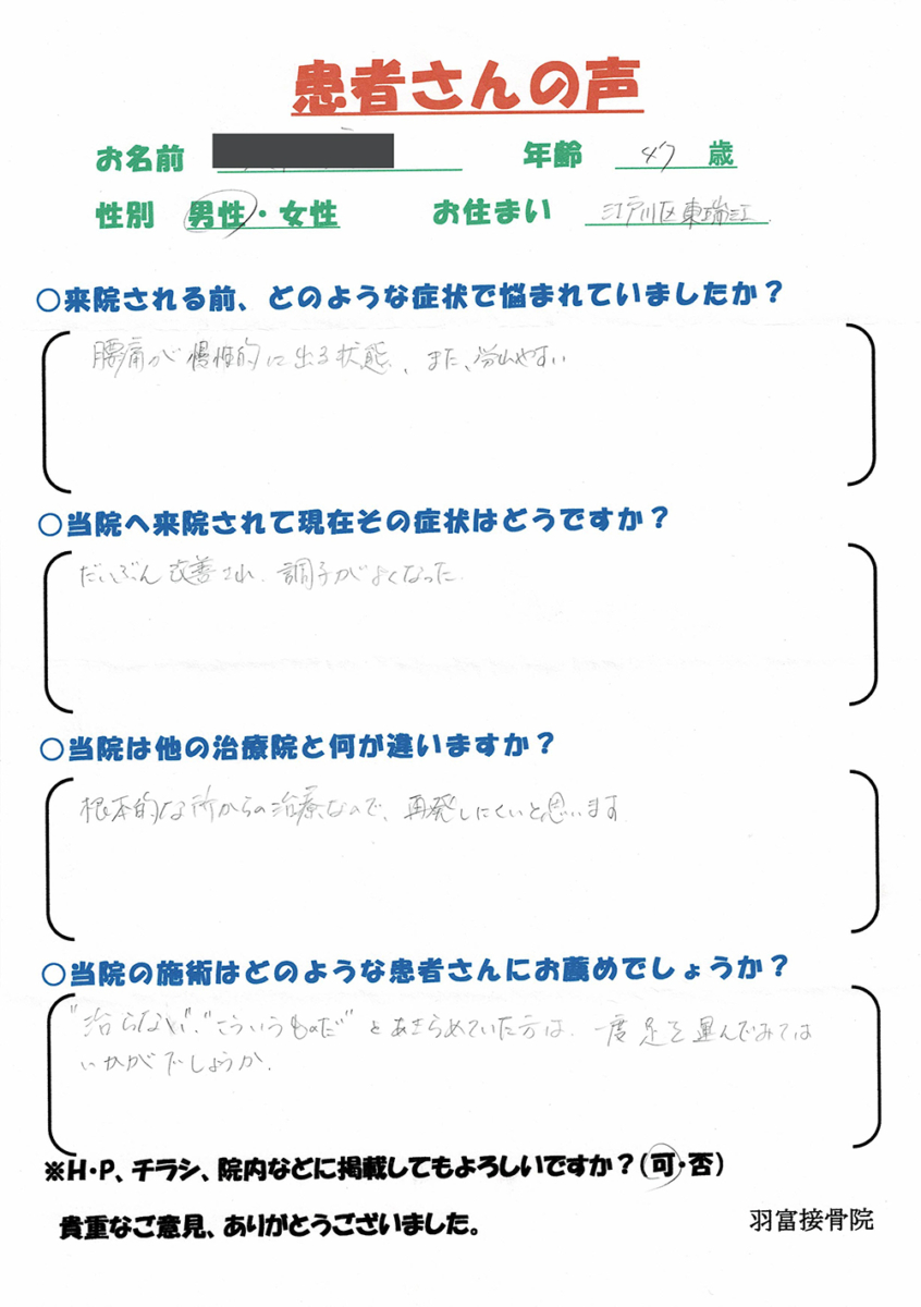 江戸川区篠崎「腰痛 痺れ 坐骨神経痛 ヘルニア 脊柱管狭窄症」 羽富接骨院